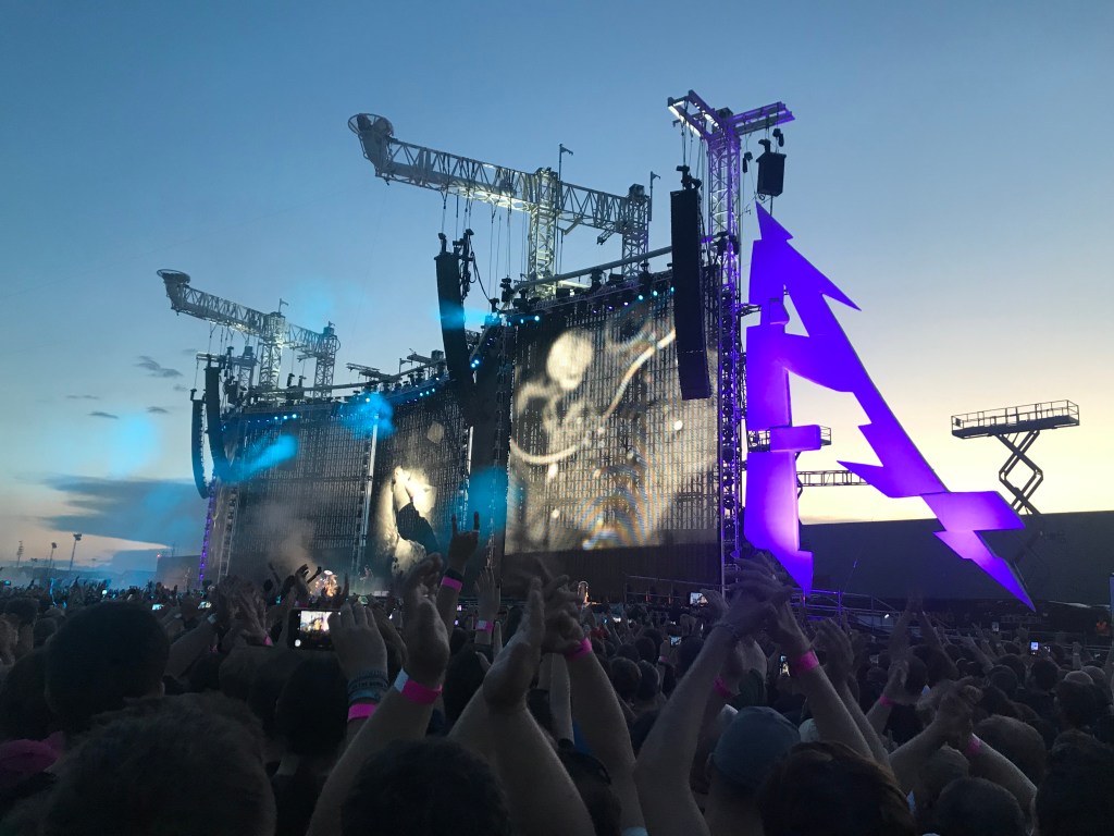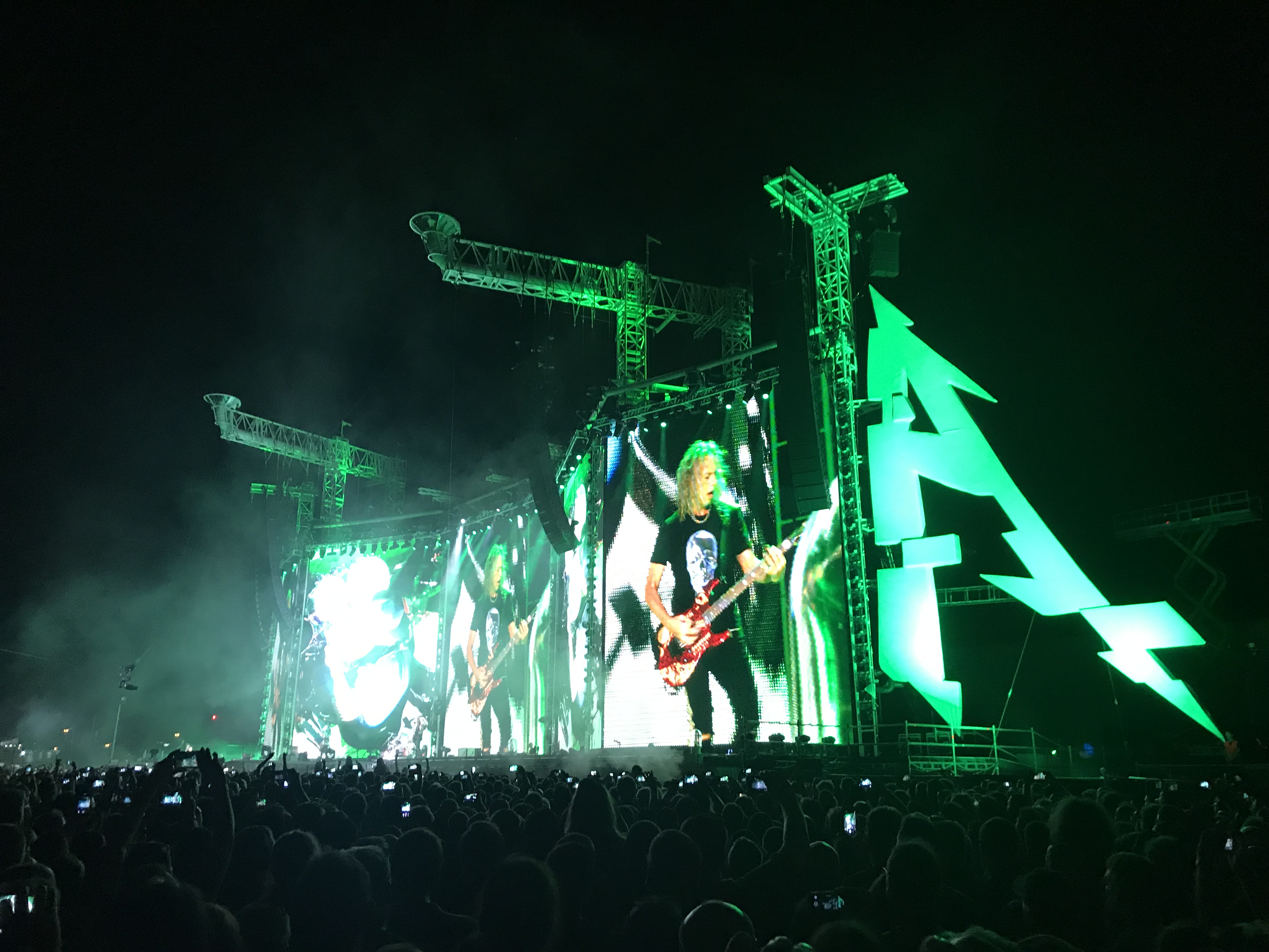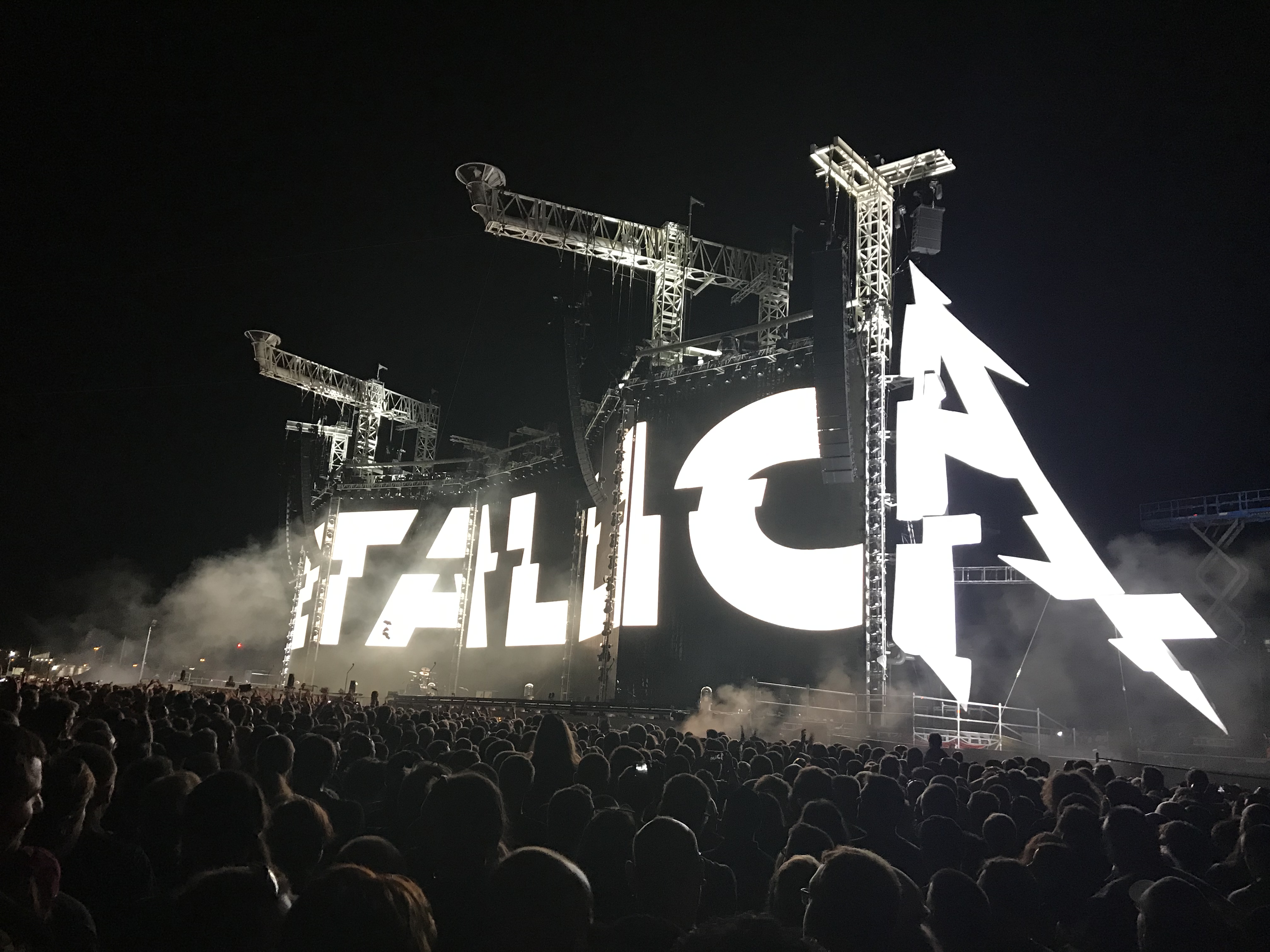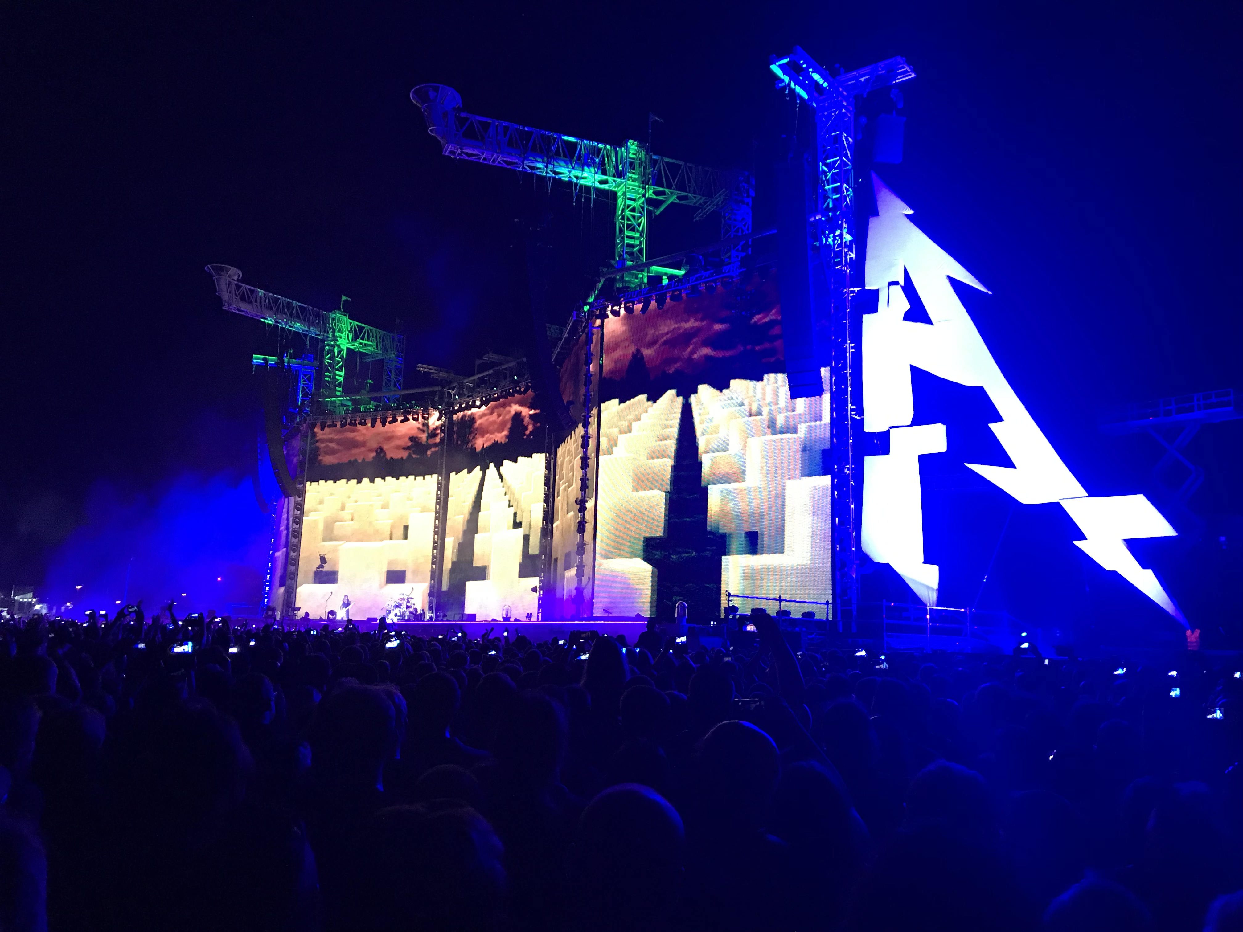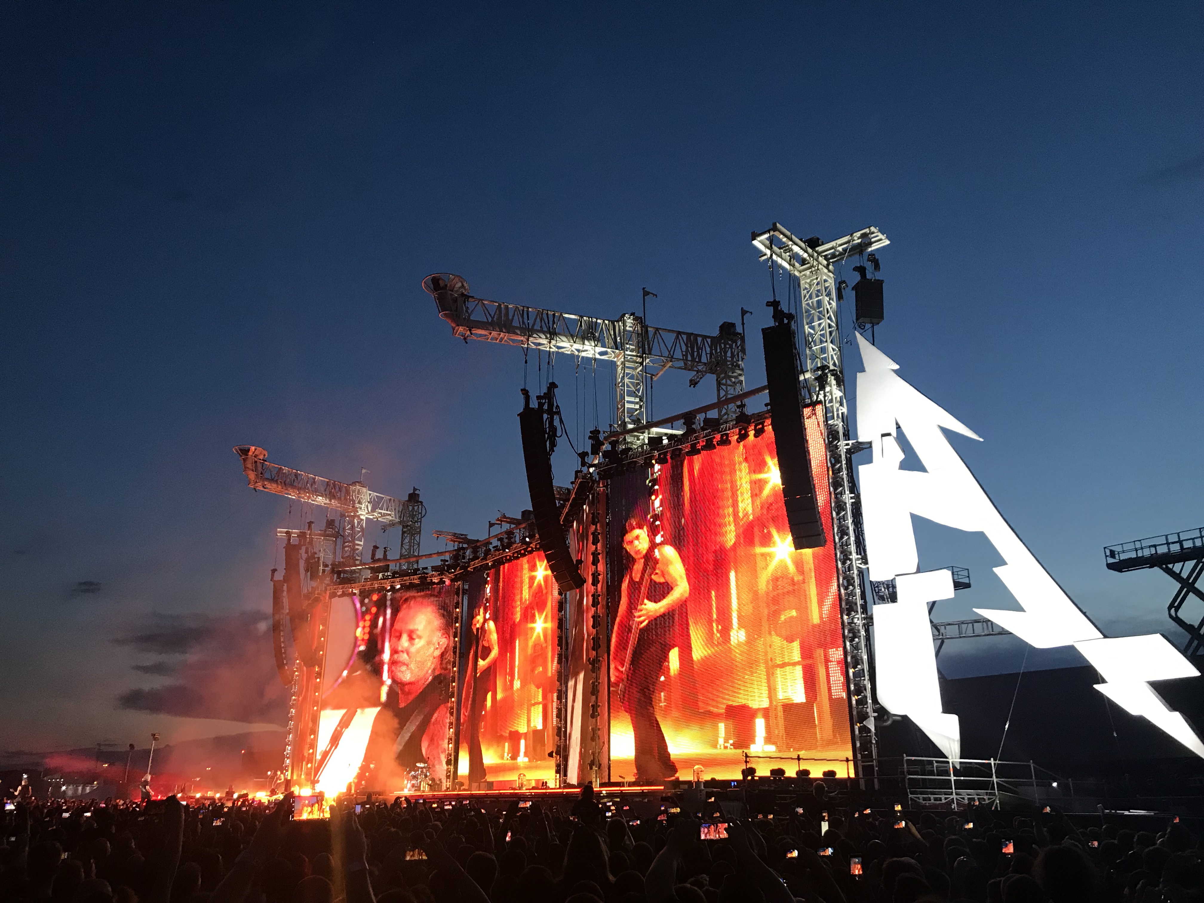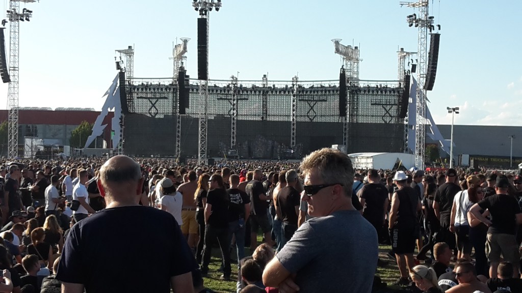 Mein erstes Live-Konzert einer Metalband erlebte ich 1994 in Merkers. Damals standen WARPATH und FORBIDDEN als Vorbands auf der Bühne, bis endlich der Headliner GOREFEST auf die Bühne kam. All das hat natürlich seine Vorgeschichte. Aufgewachsen – oder sagen wir groß geworden bin ich in meiner musikalischen Erziehung anfangs mit den Scorpions, später Guns N‘ Roses und Bon Jovi, Tote Hosen, Ärzte usw. Natürlich stand ich unter dem Einfluss meiner Freunde. Wir unternahmen so vieles zusammen, vom Skateboard und Skifahren, bis zum zelten und campen in den Wäldern. Wir spielten auch Rommee und hörten Musik. So landeten wir zwangsläufig auch irgendwann bei MTV und sahen uns die Musikvideos der European Top 20 an. Es war dann nicht weit bis zu Beavis and Butthead und Headbangers Ball, moderiert von Vanessa Warwick. Sie öffnete uns die Pforte in die Welt des Metals. Sepultura, Obituary, Cannibal Corpse und natürlich auch Metallica. Die oben genannten Mannen von Gorefest fesselten mich insbesondere und entwickelten sich rasch zu meiner Favoriteband, nicht viel später hatte ich alle CDs von denen und sie liefen auf und ab. Im September 1994 spielten sie in Merkers in Thüringen. Ich war dabei, mein erstes Live-Konzert und es war Death-Metal as it best from Netherlands. Meine Eltern werden dieser Entwicklung nicht viel abgewonnen haben, aber egal. Die Zeit nahm ihren Lauf und jeder entwickelte sich auch weiter. Mein bester Kumpel ging nach Ilmenau, später nach Jena, dann für ein Jahr nach Madrid und schließlich Bonn. Die Gelegenheiten, sich zu sehen und gemeinsam auf Konzerte zu gehen wurden signifikant weniger, je älter wir wurden. Auch familiäre Entwicklungen trugen dazu bei. Mittlerweile ist mein Kumpel ja nicht nur mein Trauzeuge und mein längstjähriger Freund von Kindheit an, er ist auch selber verheiratet, hat 2 Kinder und lebt jetzt in Chemnitz. Einen Tag vor unserer Hochzeit wurde er dort in der ehemaligen Stadt mit 3 O’s (Insider) zum Professor berufen. Auch ich war auf seiner Hochzeit der Trauzeuge. Das verbindet und man lernt es wertschätzen. Während dieser ganzen Zeit, in der er mit seiner Familie immer wieder woanders gelebt hat, waren wir Freunde, sahen uns ein oder zwei mal im Jahr. Eines blieb. Die Konzerte! Immer wieder trafen wir uns auch auf Konzerten. Vor ein paar Jahren einigten wir uns darauf, diesen Brauch zu einer Tradition werden zu lassen. Jedes Jahr ein „großes“ Konzert, bei dem niemand von uns den Heimvorteil hat, also immer weg von zu Hause, nicht Berlin und auch nicht Chemnitz. So waren wir auch schon bei „Black Sabbath“ in Essen, es regnete übrigens in Strömen. Vor zwei Jahren waren wir bei „Guns N‘ Roses“ in Hannover, es regnete wieder, so sehr, dass das Konzert abgebrochen, später aber fortgesetzt wurde. Dieses Jahr also „Metallica“. Wir hätten in Berlin gehen können – aber zum einen war ich mit meinem Chor der „Berliner Liedertafel“ in Tallinn auf der Estlandreise, zum anderen sollte ja niemand den Heimvorteil haben. Zumindest hätte es geregnet, wie aus Kannen – das hätte gepasst. Wir sind dann jetzt nach Prag gefahren, die schöne Stadt an der Moldau, wo es mal billiges Bier und hübsche Mädchen gab. Die schönen Mädchen gibt es immer noch… Zusammen mit zwei Uni-Kollegen machten wir uns zu viert auf die Reise über Dresden und Bad Schandau, durch Rathen – Kathis Heimat, kamen wir auch durch. Den mitgeschleppten Kasten Bier mussten wir in Dresden schon wieder auffüllen. Das Wetter war spitze, es war heiß und Ärzte raten dazu, bei hohen Temperaturen viel zu trinken. Done! In Prag wurden wir von einem Professor-Kollegen der Prager Uni abgeholt, ja das Netzwerk reicht weltweit, nirgends können wir uns blicken lassen, ohne erkannt zu werden. Somit war die Gruppe vollständig und nach Ableistung der organisatorischen Dinge fuhren wir dann also zum Flughafen Prag Letnany. Schon die Ankunft war sehr abenteuerlich. Menschen über Menschen, es rauschten Zahlen an uns vorüber, wie viele Fans wohl erwartet werden, am Ende pendelte sie sich zwischen 70 und 80.000 ein und irgendwo da schien auch die Wahrheit zu liegen. Wir mussten noch was essen und Frischbier wäre auch nicht schlecht, beides war in Sichtweite, aber wie dahin kommen im Meer aus Menschen? Wie auch immer, es gelang. Das Hindernis der Fremdwährung umschifften wir ganz gekonnt, indem wir unseren tschechischen Professor anpumpten und uns tschechische Kronen von ihm liehen. Am Ende werden wir viel zu viel ausgegeben haben für das bisschen Fresserei. Aber egal. Die Sonne schien, das Wetter war super und das Bier kalt – Herz, was willst Du mehr? Wir brachen nach der Stärkung auf und mussten einmal um die künstliche Arena herum laufen, um zum Eingang der Front-of-Stage-Zone zu kommen. Dort angekommen, war noch viel Zeit bis zum Einlass, wir verkürzten sie mit kaltem Frischbier. Angetan war ich von der futuristisch wirkenden Bühne. Große Bühnen kannte ich immer nur mit Dach, der gewohnte grau-schwarze Kasten eben. Diese hier sah eher aus wie ein Triptychon, besser 2 nebeneinander, denn es waren 5 Elemente, die im Zickzack aufgestellt waren. Am linken Rand das „M“ und am rechten Rand das „A“ von Metallica in deren typischen Schriftart. Die Ausleger zweier Kräne ragten von hinter der Bühne darüber hinweg nach vorne und verrieten vorerst noch nicht, was sie später tun, ließen jedoch schon mal eine großartige Bühnenshow vermuten.