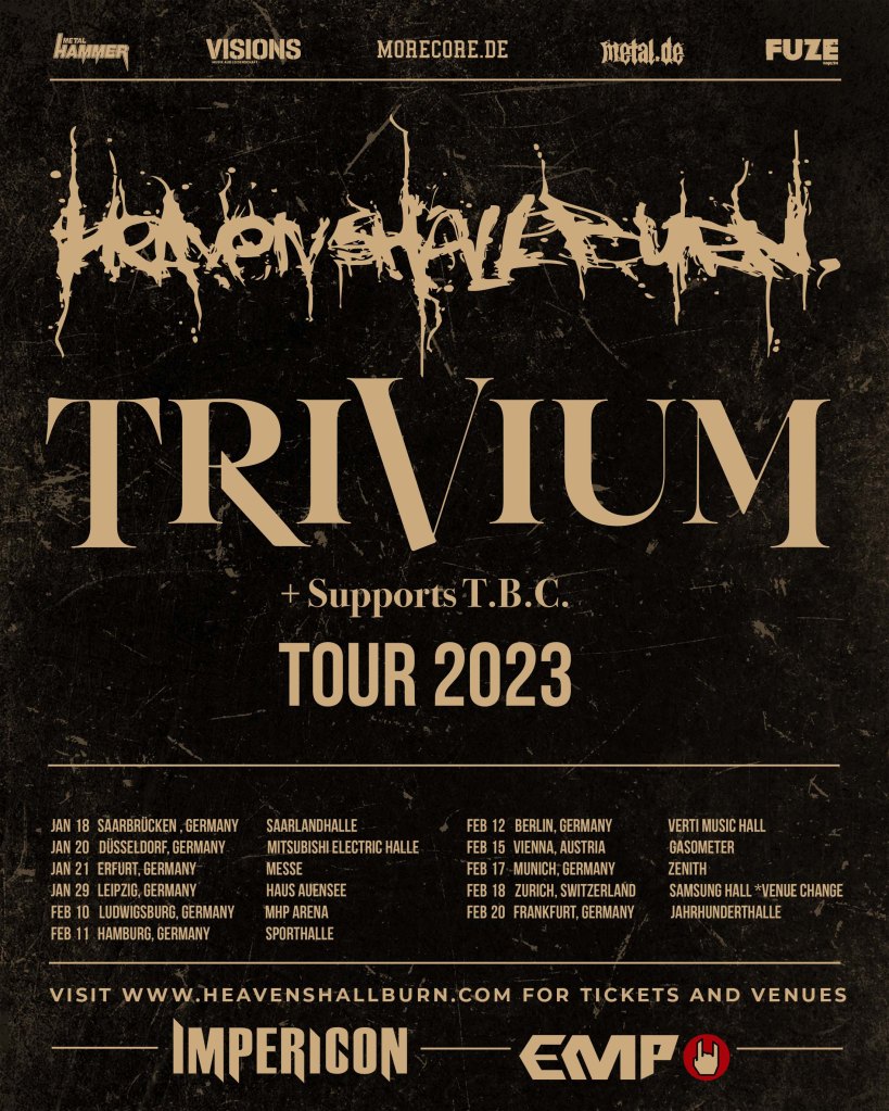 Am Sonntag war ich dann mit Martin bei „Heaven Shall Burn“ in der Verti Music Hall. Ich sehe schon wieder viele Fragezeichen ob des Bandnamens. Also Heaven Shall Burn – nennen wir sie kurz HSB, ist Death-Metal der Superklasse und zwar aus Saalfeld in Thüringen. Gegründet 1995, ich war von 1996 bis 1999 im Internat im benachbarten Pößneck um dort zu einem Offsetdrucker zu reifen. Von der Gründung von HSB habe ich trotzdem nichts mitbekommen und ich kann auch nicht sagen, wann sie mir das erste Mal auffielen, aber irgendwann kannte ich sie natürlich. Als eine kleine und noch unbekannte Death-Metalband aus Thüringen. Damals hätte niemand gedacht, dass sich diese Band mal so mausern würde, dass sie heute große Hallen füllt und über die Kontinente tourt. Weitaus bekannter war mir die andere Death-Metalband, „Obituary„, sie gehörte und gehört auch heute noch zu den „Großen“ der Branche, jedoch spielte Obituary jetzt als eine von 3 Vorbands vor dem Headliner Heaven Shall Burn. Vor 20 Jahren hätte man jede und jeden ausgelacht, der diese Konstellation vorausgesagt hätte. Heaven Shall Burn war sogar mal Sponsor auf den Trikots vom FC Carl Zeiss Jena. Jedenfalls war ich mit Martin beim Konzert der gerade stattfindenden Tour von HSB, zusammen mit TRIVIUM, OBITUARY und MALEVOLENCE als Vorbands. Passender hätte die Terminfindung gar nicht sein können, denn Samstag war das Eisbeinessen der BL und Sonntag ein Death-Metalkonzert der Extraklasse. Über genrebedingte Schubladen wollen wir hier gar nicht reden, Chormusik und Death-Metal gehört für mich zusammen, wie Schokoeis und Glühwein, mag ich auch beides… Nun ist die Verti Music Hall ja noch ziemlich neu und ich bin begeistert, was dort für ein Sound gegeben ist. Es klingt alles messerscharf und im Gegensatz zu anderen Hallen wird hier nicht versucht, mangelnde Soundqualität durch Lautstärke zu kompensieren. Ich mag es laut, aber wenn ich Klebeband brauche, damit mir die Brille nicht wegfliegt, ist auch etwas verkehrt… Es war ein sehr cooles Konzert, es hat Spaß gemacht und ich gönne HSB den Erfolg. Die Ansagen im ostthüringischen Dialekt, MEGA. Da wird Kultur in die Welt getragen!